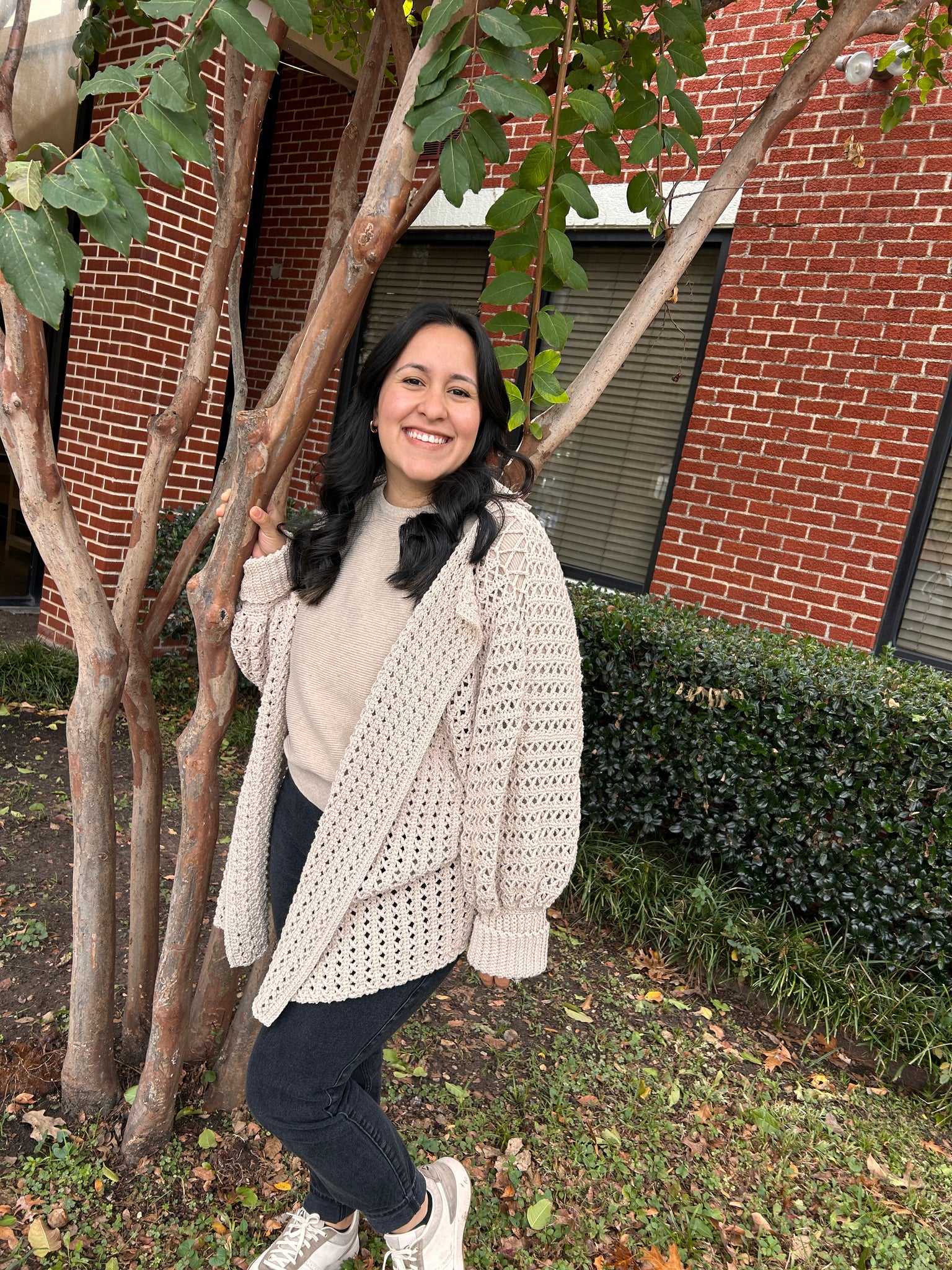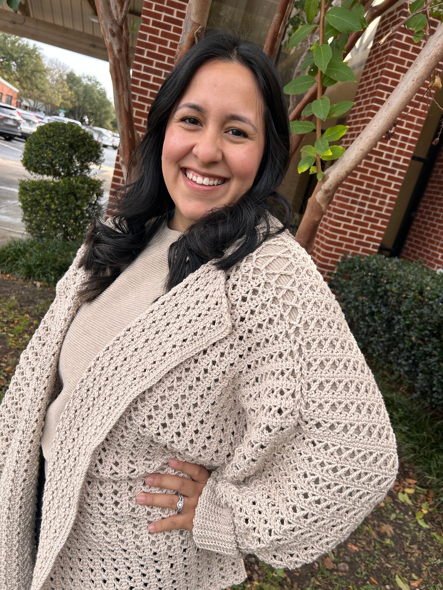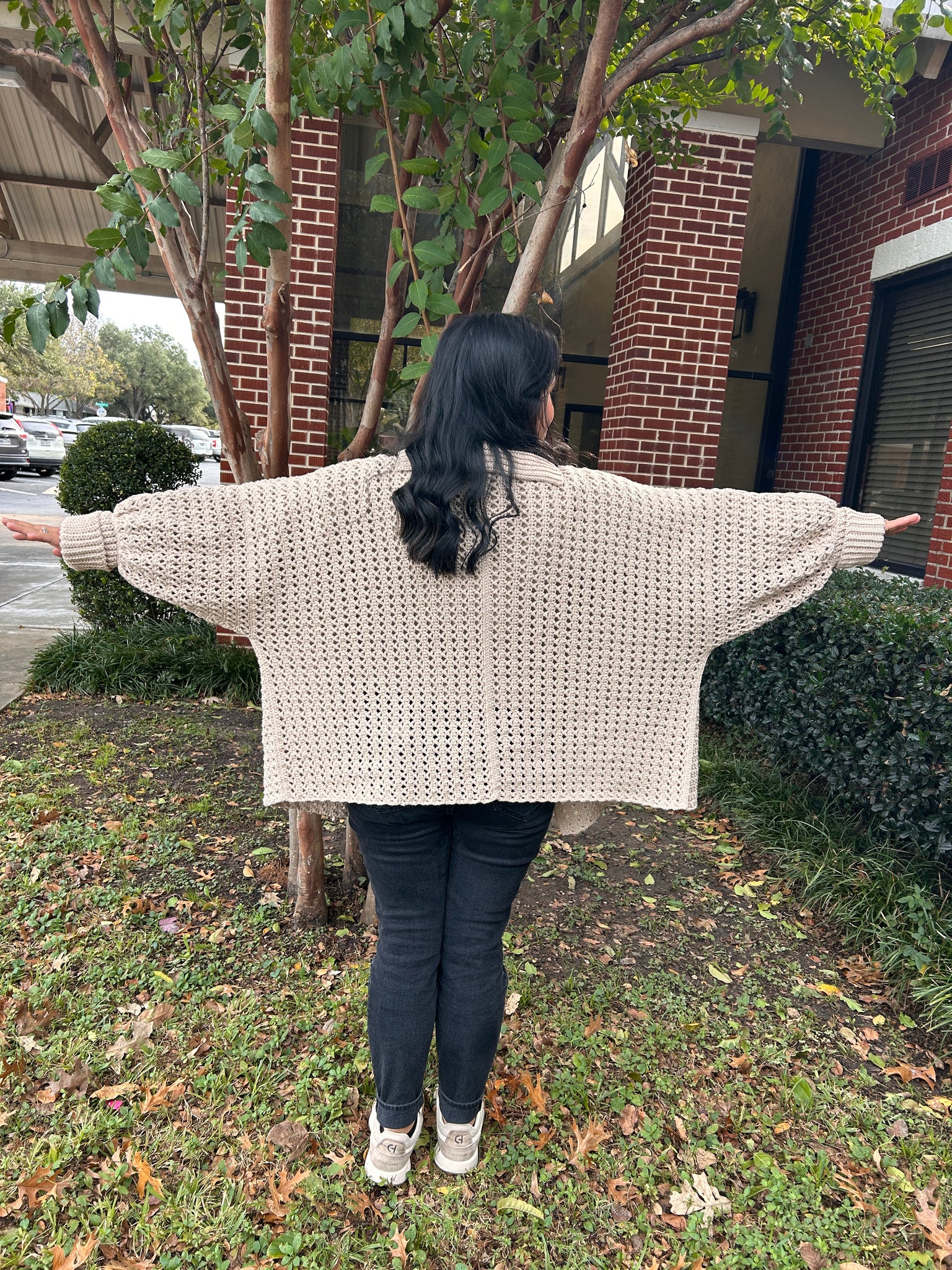 The Primrose Cardigan combines natural comfort with artisanal craftsmanship. Crocheted from a luxurious blend of 50% cotton and 50% bamboo, this piece offers breathable softness with gentle warmth. This cardigan features a distinctive stitch pattern, hand-crafted to showcase its one-of-a-kind character. Perfect for layering or wearing alone, it delivers both coziness and refined elegance for the discerning wardrobe. It features an oversized fit, with a one-size-fits-all design.
